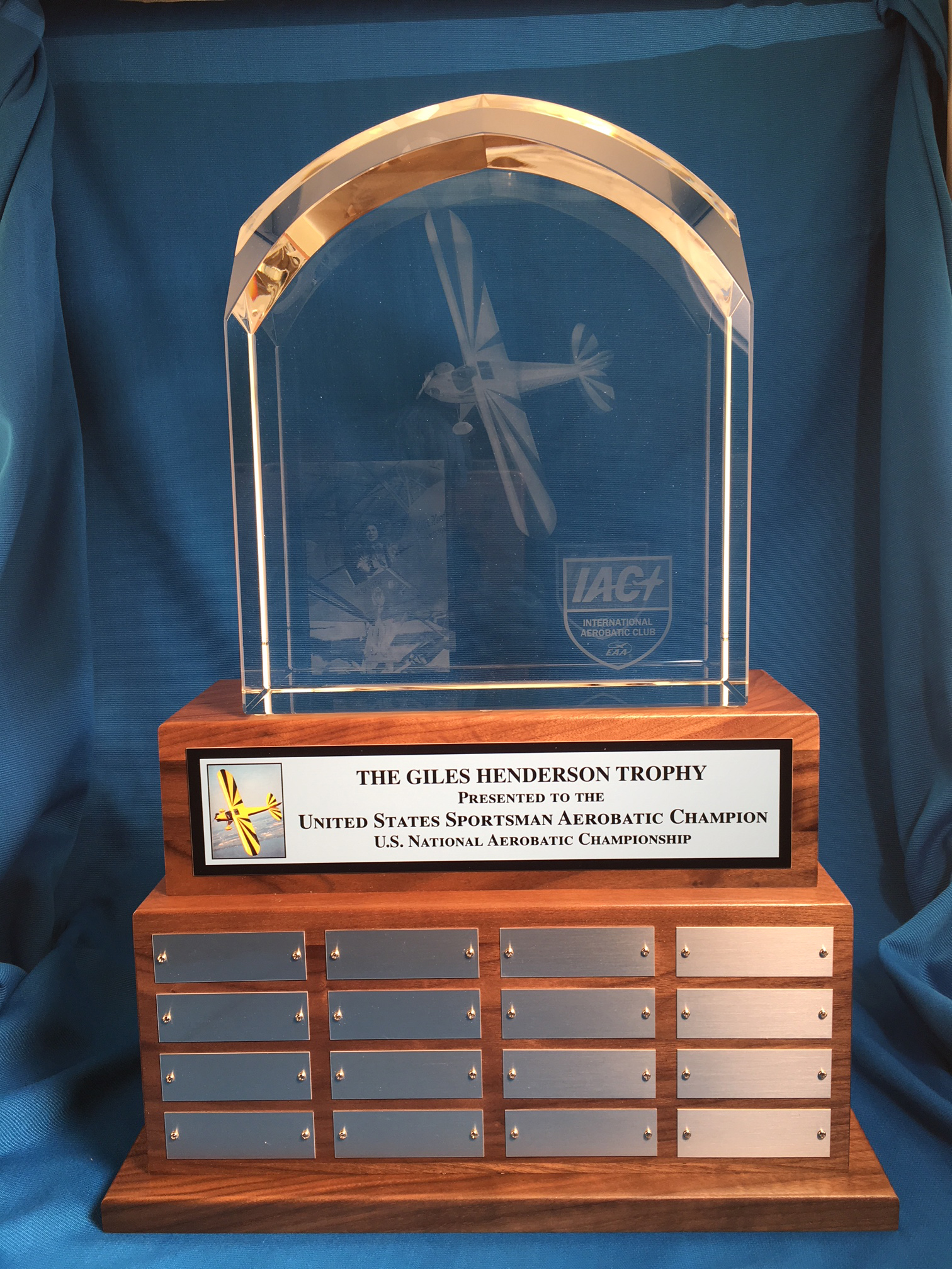 Presented to the winner of the Power Sportsman category at the U.S. National Aerobatic Championships. Conceived by Mike Heuer and funded by donations from friends and the IAC members in memory of Giles Henderson , the IAC Hall of Fame member. details |