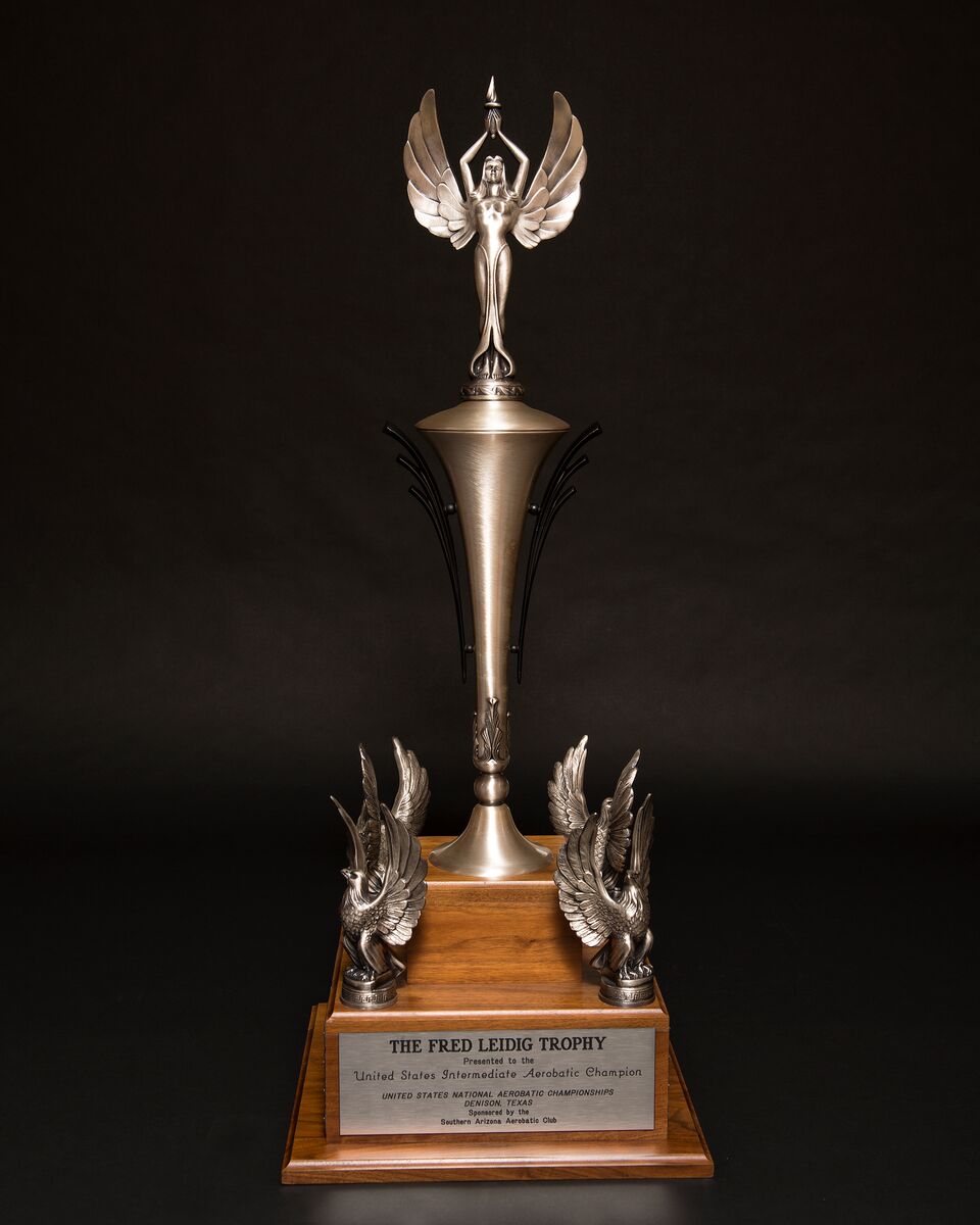 The Fred Leidig Trophy Conceived and donated by Robert Wagstaff of Anchorage, Alaska and presented on behalf of the Southern Arizona Aerobatic Club, IAC Chapter 62. Since Fred Leidig was a former IAC Intermediate Champion, this trophy is presented to the winner of the Intermediate power category at the U.S. National Aerobatic Championships. details. |